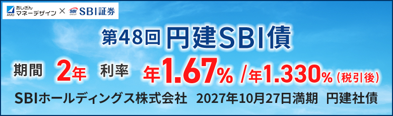 第48回SBI債※1 | 1.67% | 本債券は10万円以上10万円単位で買付可能です。 債券は預金と異なり元本保証がありません。 |