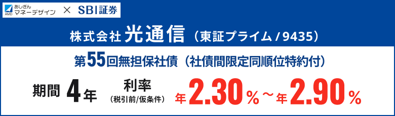 | 株式会社光通信 第55回無担保社債(社債間限定同順位特約付)※1 | 2.30%~2.90% | 本債券は50万円以上50万円単位で買付可能です。 債券は預金と異なり元本保証がありません。 |